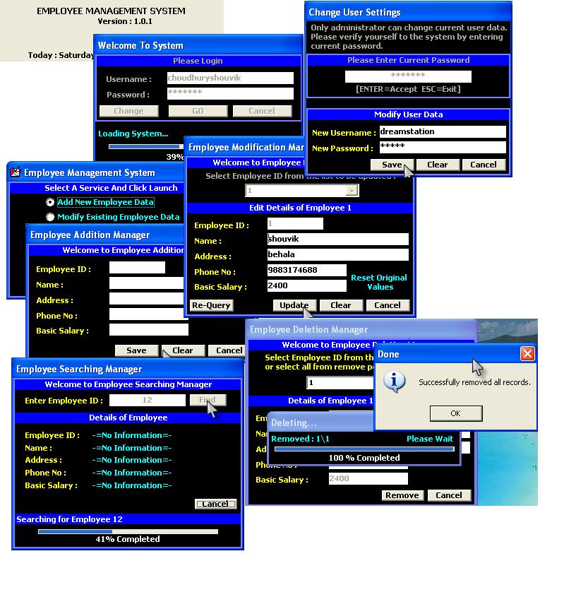 This is a yet completed employee management system.I developed this application as a project for my course semester. It has the functionalities like addition,modification,deletion,searching,etc. with nice gui(see screenshot). This code will teach you some basic and advanced strong field validations.I think this code is not too much complicated to understand.If you find any bugs please notify it by posting your comment.Any suggestions for improving this application will be appreciated.If you like this application then please vote for it.It will encourage me to post some more advanced applications on VBC in future.