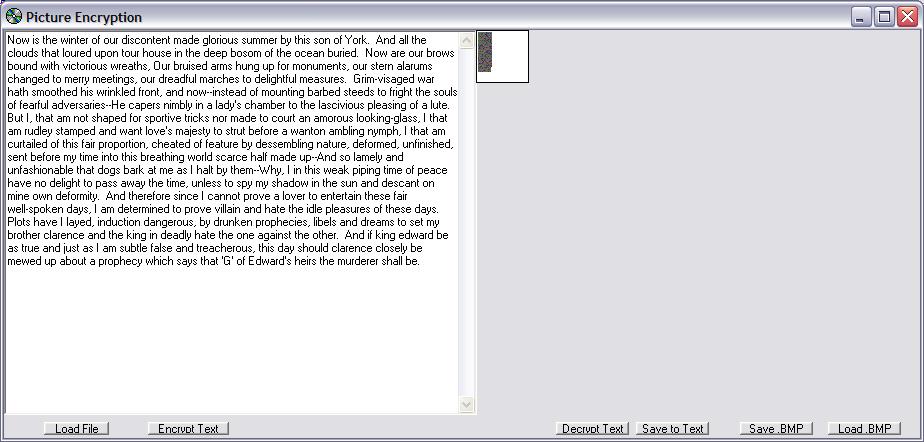 Now, from the great people who brought you the Venus Project and the Color Weaver, another great graphics program! Type in any text and it will encrypt it into a .bmp file. See Screenshot! Automatically saves .bmp files to C:\Encrypted File.bmp so you can just encrypt and close the program, and it will automatically load ht picture from the same place. Want to encrypt more than one file? No problem! Options to save and load other .bmp files! can't copy and paste? No problem! Options to load and save text files! Updated version here: https://www.vbcoders.com/vb/scripts/ShowCode.asp?txtCodeId=32666&lngWId=1