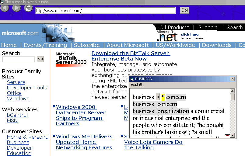 The most difficult and the core technology of this software is finding what word is under the mouse cursor. The current solution is to insert tags on all the words but this isn't reliable and has a lot of bugs. It has difficulties with frames, too. If you can think of any other methods, please post them!!