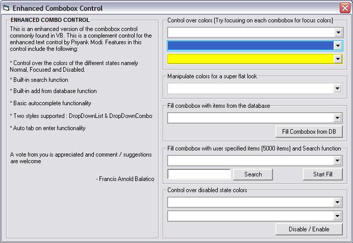 This is an enhancment version of the combobox found in visual basic. A complimentary control to Priyank Modi's Enhanced Text Control. Built-in features and added GUI control are the highlights of this control. Hope you like it.