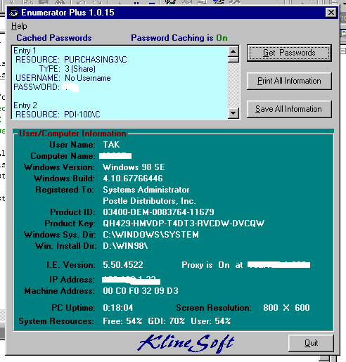 This is an update to my post of a week ago. It now saves to file, shows if password caching is on or off, and displays proxy on/off status and ip of proxy. Removed gradient affect for faster loading. Next version will have ability to toggle password caching on/off, change computer name, change registered owner and backup the registry. Hope you all enjoy this. Use very carefully. I cannot be responsible for any misuse of this program.