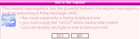 A superior, in many ways, messagebox. Based on my yesterday submission with improvements. It is in the form of an activeX (usercontrol) now and has 6 differents "skins" (red/candy/blue/orange/yellow/silver) has an option of showing the message with no buttons and self closing as fast as you specify...and you can have a picture, any type, any size. This really makes microsoft messagebox look flat and boring.