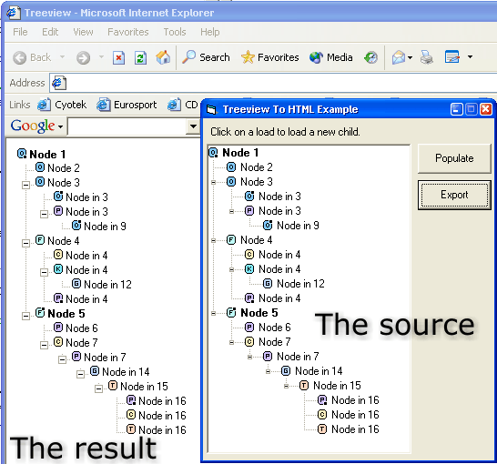 This code takes a treeview as parameter and generates HTML that exactly represates this treeview. This includes indentation, images, bold-text, etc.