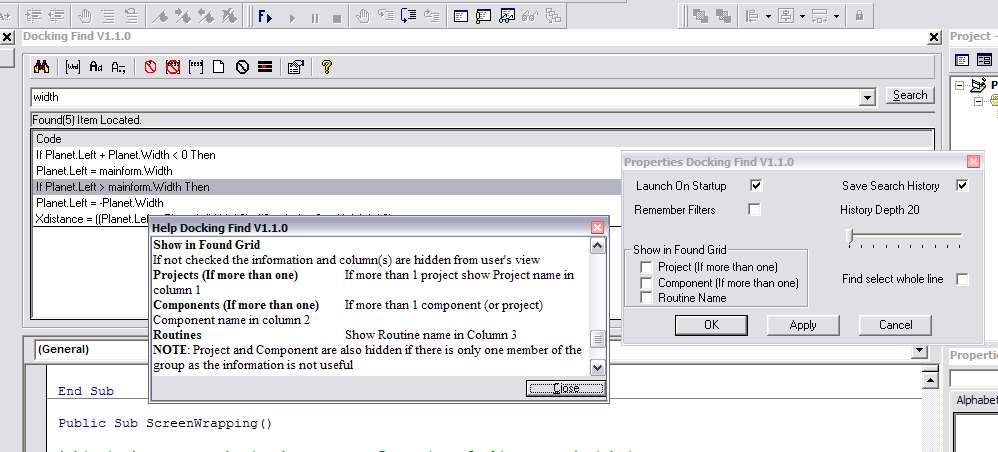 ver 1.1 uses grid tool instead of listbox to display finds. This is a re-write of my earlier Find Add-in using a UserDocument. Mostly just an experiment for a conversion of my Code Fixer. You can search for whole words, parts of words, case sensitive or insensitve, punctuation aware, ignore comments and strings or only find strings and restrict to current code page of code. Once launched you can also search for new items simple by selecting the word in code and pressing a button. Added settings screen which allows you to launch Tool on VB startup, save previous searches and filter settings between runs, set limits (20-400) on search history. For add-in programmers check the code around PasteFace command for a solution to the problem of destroying the clipboard contents when using this