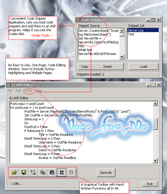 Ez ASP Editor is an ongoing project of mine. I started it because i had no ASP editor... plenty of HTML editors out there, none of these. It is a text-editor with a Code Snippet Loader. View the ScreenShot to see. It just makes life easier for ASP programmers, the Snippet loader will let you load snippets from a directory, codes within this directory are normally "frequently used" codes, that you don't feel like retyping. it has a graphical toolbar with all handwritten functions in VB of course! No API