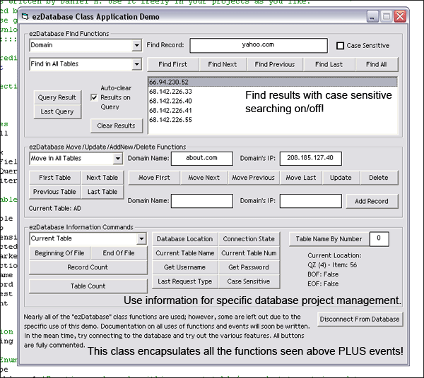 This class makes VB Database Applications easy to write on the fly! This class includes over 30 functions for ADODB programming in VB! It encapsulates all the Find Functions, Move Functions, along with AddNew, Delete, Update functions and a ton of error trapping for easy use! Also includes events to program at your disposal! Please leave comments/feedback and vote if you'd like. This is my first class file I have been working on.