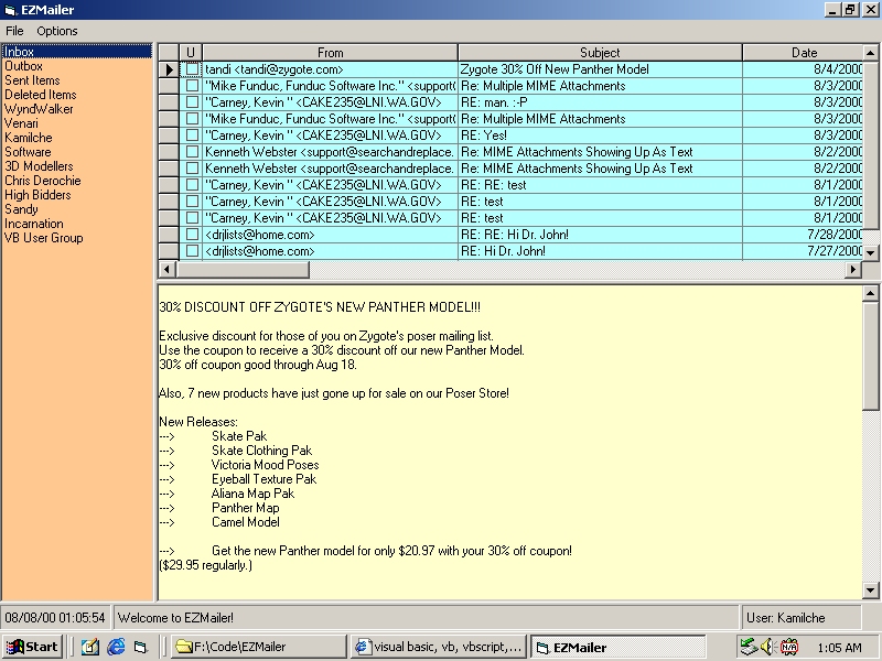 Are you tired of Outlook and Outlook Express hanging your machine, and letting the KAK virus in? Well, I am too, so in response, I made EZMailer, a simple email program that sends and receives mail, PERIOD. It doesn't attempt to interpret or auto-execute ANYthing, thus sparing you from the vagaries of security loopholes in 'advanced' mail programs. This program receives incoming mail from a POP3 server, sends outgoing mail through an SMTP server, handles MIME attachments, multiple users, and automatically routes incoming mail to folders based on criteria you specify. Note that to successfully execute this code in the runtime environment, you must own Apex Software's TrueDBGrid Pro, www.apexsc.com; and Funduc's Encode/Decode DLL, www.funduc.com