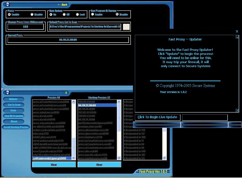 Scans proxy lists and returns if they are active or not then allows you to scroll through the list changing your ip everytime a new browser is opened. I need to make it detect active proxy by returning header. Rite now basically all it does is ping to see if proxy ip is online or not and trust that you make good proxy list and only add proxy ips to your lists. I think it has potential just needs some TLC.