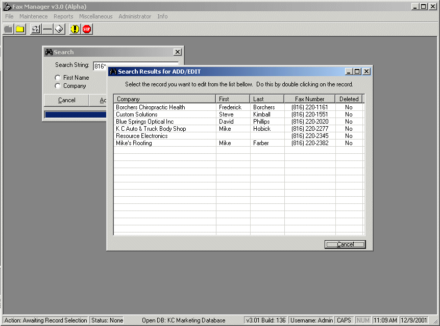 This program uses three different Access 2000 databases. One database is for user and configuration management, while another is the fax list itself, and finally there is a database for the export routine.