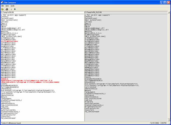 File compare utility to compare two ASCII text files. Differences are highlighted in color. Options exist to add additional text file extensions, to define default directories for the two compared files, and to select a particular font to use in the display. A basic print function also exists. I originally created this utility for use in comparing program code, but it can be used for any text file.