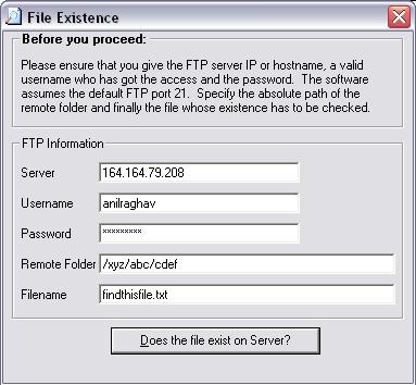 Use this program when you want to check if a file exists on the remote FTP server. I wanted an application similar to this very badly, but, coudln't find one anywhere. So, I decided to write this. This is an extremely simple program without any API, OCX,DLL etc. I assume you can use FTP from the command prompt.