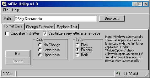 This real time-saving program lets you format filenames to your liking. Don't you get really annoyed when you download your favorite MP3 music and there are those _'s in place of every SPACE, wish you could get rid of them out of your hundred of files??? Now YOU CAN! It will replace or remove characters from filenames, it format its CASE and will change file extensions. Get it today!!