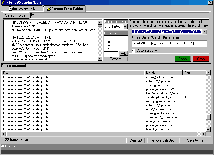 Extract Anything from anything. RegExps for email, phone numbers, creditcard#s and more included. Also includes link to regular expresion tutorial.