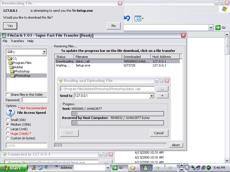 FileZach is a perfomance driven application which uses the Winsock control to send and recieve files from one computer to another. While not exactly 'super fast' (as its brother FileZap), it is much faster than tradditional email/im clients. To start off, you can choose 5 basic upload/input speeds. The first one, small, will open the file in binary mode, and input 1024 bytes (1kb) and send it to the remote user. There is then Medium (10kb), Large (1mb) and Huge(10mb). Due to perfomance issues with your computer, I recommend you select 'Medium' first, then if your pc can handle it 'Large'. Huge on my own development computer (Celeron1.5/128ram) caused crashes and freezes with the application and windows. For your convieniance, you can monitor two upload speeds, wherein most apps only have one. The *Sent* progressbar monitors how much data you have sent via winsock to the remote host. The *Recieved* progressbar monitors how much data the remote host has recieved and written to disk. While using larger input speeds, keep in mind that if the remote host computer is much slower than yours, you may see that the upload bar is much farther than the recieved one. You can monitor all downloading files on the listview on the main form, and click on an item to see its progress. If you do not want to recieve any files, goto File --> Disable, and the winsocks will stop listening for connections. IF you would like to send a file goto File --> Send, or if you would like to cancel all downloads, goto File --> Disconnect all. I look forward to hearing your feedback and/or votes, please report any bugs you find in this application. If I get enough response, I'll start working on FileZach Plus+, which will have File Sharing, operate as a download manager for internet explorer, will include compression/encryption and also UserToUser chat while files are being transfered.