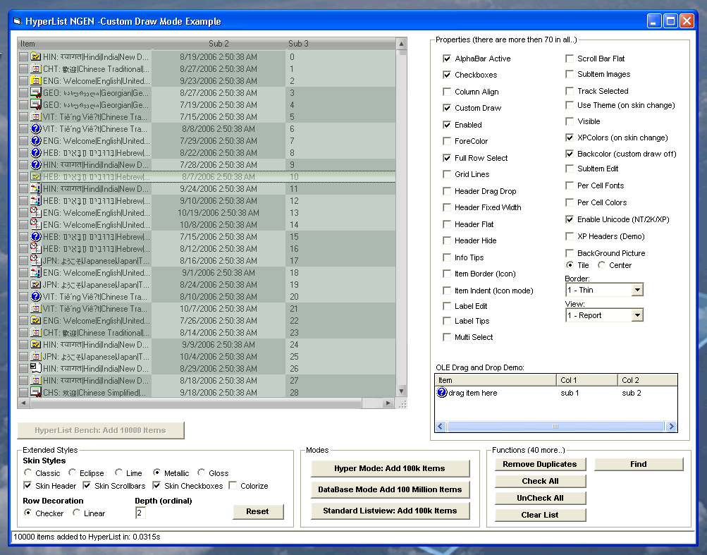 Three data access modes, Virtual, Custom Draw, and Hyper Mode. All of them unbelievably fast. Built in storage and sorting in a virtual listview hybrid.
