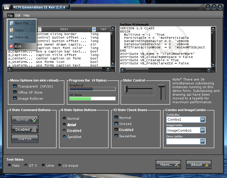 Added transparency and extended styles to menus. Now skins: Form/menu/command button/option button/checkbox/combobox/imagecombo/drivelist. Added alpha and 32b bmp support w/ auto-converter, transparency color auto-mapping, and tons more..