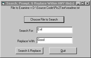 This code example will search within any file (even binaries), of your choice, for a string of your chioce, and replace it, with another string of your choice. when it finds a Match to your search, it will Display the last 128 Characters which contain your string. Then it'll Propmt you if you'd like to change this instance(s) of your String. If not, it'll travel onto the next Instance, Display new results, and Prompt you again... I Originally used it in Access VBA, to Insert SQL Formatted dates, into Select statements within SQL Files, before sending them to the pl/sql server. It only took a few moments for me to convert this to work with any filetype. Note that the Replace String shouldn't be longer than the Search String (Commented in Code).
