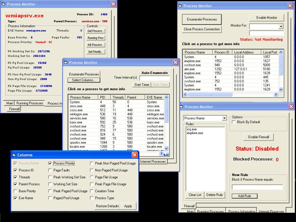 This code enumerates all running process and determines which processes are services, system, and user-run processes. You can pull just about any infomation you want from a process. The program cna also enumerate processes on ports (Using the internet) and can monitor for any you specify and close the connection.