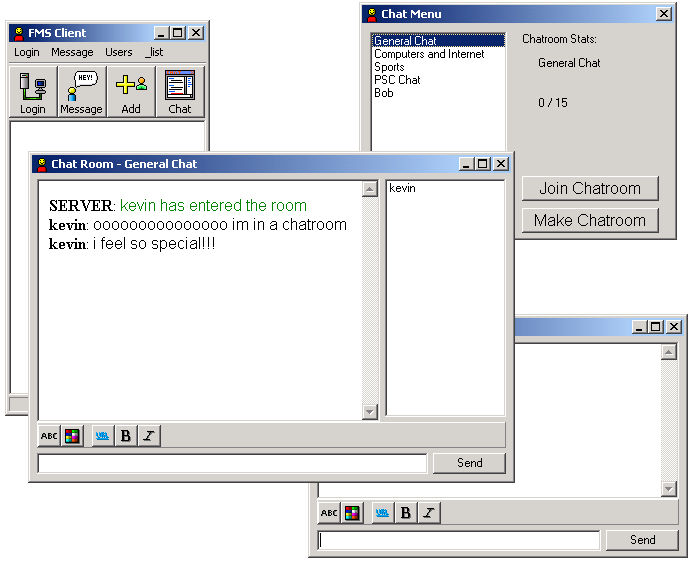 This is a full-fledged Instant Messenger system (w/ out encryption :(). Anyways, the features include... Instant messaging to any online user (duh!), multiple chat rooms, emoticons, buddy list (stored on server so you can access anywhere), username and passwords, and (to be added soon) p2p games and mail. This is just a beta so it will have its bugs (i havent seen any yet but im sure you people will find some :)) please comment and please please suggest things and if you are going to suggest it then please tell me howto implement it. --- I am not hosting the server, 1. because my computer cannot stay on all the time (im not allowed to keep it on all the time anyways), 2. because of security, i dont want to have my ip publicly known... so youll have to run the server and client at the same time on your computer for it to work