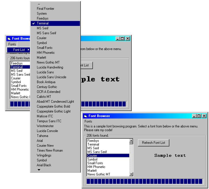 This program will grab all screen fonts avaliable, and add them all to a list, and to a menu! So you can select the font from a menu! Also, when a font has been selected, the 'Sample Text' font will change to the font selected. So you can preview fonts before you use them! And the list and menu's are in sync. So if you select something from the menu, it gets selected in the font list! Please vote for me!
