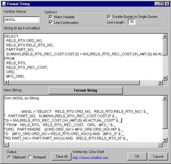 Formats SQL Strings so that they can be placed into you code quickly and easily. How many times have you spent several minutes formatting a SQL statement in your code.