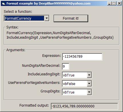 Demonstrate use of FormatCurrency, FormatNumber, FormatDateTime, FormatPercent. Good for beginners. Easy to understand.