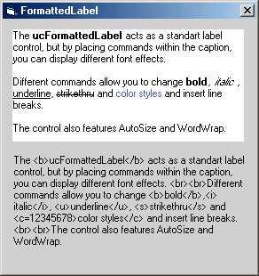 The FormattedLabel acts as a standart label control, but by placing commands within the caption, you can display different font effects.