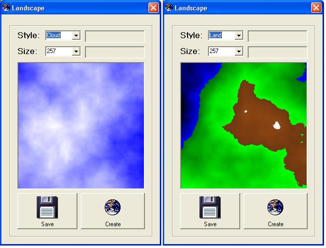 This code uses the same algorithm (Iterative Square Subdivision) to create either clouds or landscapes. In addition, it could be used to create plasma fractals and 3D mountain landscapes. This is all done randomly, so each picture is unique. I have also added the capability to save the picture. I have added my version of the save routine using common dialog.