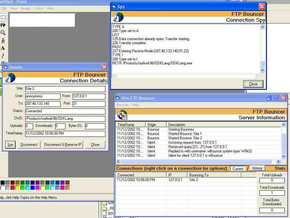 This is a complete ftp bouncer application for windows. It allows you to "bounce" connections to ftp sites through this software. And it has a built in telnet server that gives you complete remote administration and contorl. It is about 90% complete (still some things I should do to improve the identd code). Its got a good gui, allows you to spy on connections. It also allows you to disable downloads, uploads and site commands. It shows you all kinds of statistics on each connection when you are spying. Everyone ftping through a bouncer needs to remember that they have to set their ftp client to PASV (passive) mode for it to work.