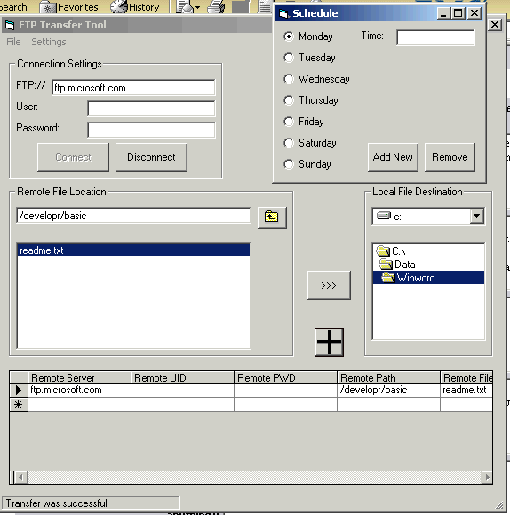 The application collects Remote and Local file information from the user by requiring a valid connection to a site before addition to the Transfer List can be completed. Items that are saved in the Transfer List are prepared to be transfered according to the schedule that is established by the Scheduling form.