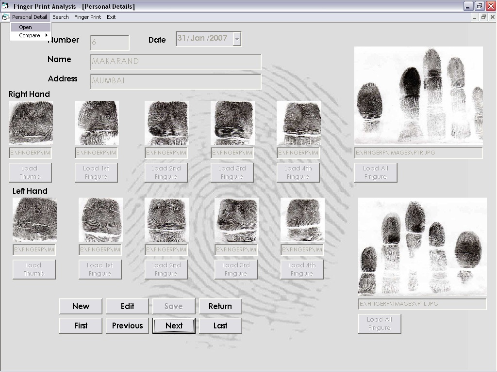 It is a project developed at our organization for comparing two persons fingure prints are identical or not. can be used in security systems, it had got capability to inert new records to the project, can be upgraded with new human interface device attachments for caputuring the images for getteing the images for live comparision