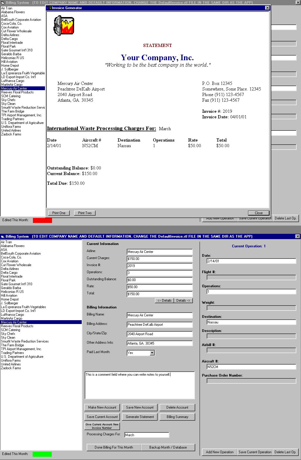 This is an accounting or invoicing program that i made using databases and rich text files. I tried not to use any complicated OCXs like report designer or any control like that, which i have seen in other submissions. With this program, u can make accounts, delete accounts, edit the account information, enter information into invoice, toggle through multiple rows of information, generate an invoice or statement, and at the end of the month, you can generate a billing summery with all the account's information for that month. There is an automatic backup feature where whenever you generate an invoice, it saves a copy on your hard drive for later access. There is even a feature that you toggle when you are done editing that companies information for the month, which adds it to the billing summery and marks it with a bright green label, to indicate that you don't need to do it again; it is done. There are still a few more feature that i would like to add, but a few of my friends are pressing me to submit this. I am anxiously awaiting feedback on this, so if you like it, or don't like it, please leave feedback that tells me what to change. I have seen before feedback like "I like it" or "It sucks" and vbcoders.com was made for people to share their work and their ideas about other's work, so please keep the vbcoders.com alive and uncorrupted. I can't really tell ya to vote for me, cause it doesn't really effect people's opinion positively when every button they click says "VOTE 4 ME!!!". Well, that's ab00t it, i hope you enjoy.