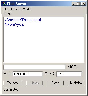 Fully loaded chat program. Uses winsock control. Can save and print chat session. Can start with windows using the registry. Sound clip upin incoming message and window comes to front of screen. Can change color of text. Single client/server in one exe file. Has auto update feature and retrieves newwest version if there is one. File transfer and ping.