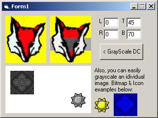 Nothing special. An example on how to extract a portion of an image or DC into a DIB Section. The project basically is gray scaling, but the guts of the project can be used for most image byte processing. I wanted a way to extract only a small piece (16x16) of a large bitmap, but didn't want to extract the entire bitmap into an array. Also, I needed to be able to update only that small section (16x16) in the appropriate location. This sample project shows how I plan on doing it & thought it might be of use to some of you too. The routines, by using DIB Sections, are extremely fast, regardless of the size of the target. Tweaked just a bit: 3 Oct/15:00 est