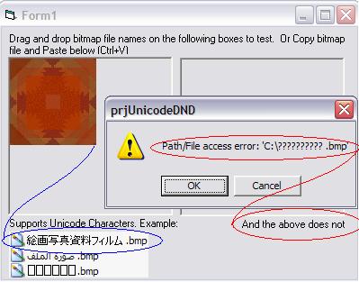 Add unicode filename support to VB when dropping files or pasting files. Making attempts to understand unicode support, I am discovering some shortfalls within VB. And in this specific case have not found a workaround for the problem so I thought I'd post my attempts. The problem can be experienced when a file name or path name has unicode characters (see screenshot). Unicode support is rather new to me and I am learning as I go. I think this mini-project may help others too. 23Apr07: Removed TLB requirement; no TLB used. 23Apr07: Found logic error. Assumed AddRef was being called by DispCallFunc but it was not; therefore, fixed error that would be calling Release when it shouldn't which could crash IDE.