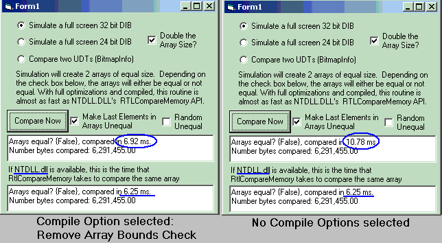 Want to compare 2 same-size bitmaps for equality? Want to compare 2 arrays for equality (even if arrays are different VarTypes)? NT-based systems have RTLCompareMemory, C has MemCmp. Win9x is reduced to byte by byte loops, more or less. This twist on that loop process comes really close to matching the speed of the two aforementioned API functions and can be used in every O/S. Thought I could use this for a project of mine, but the requirement went away. Compile the project for true tests (IDE is always slower). As always, stuffed with lots of comments.