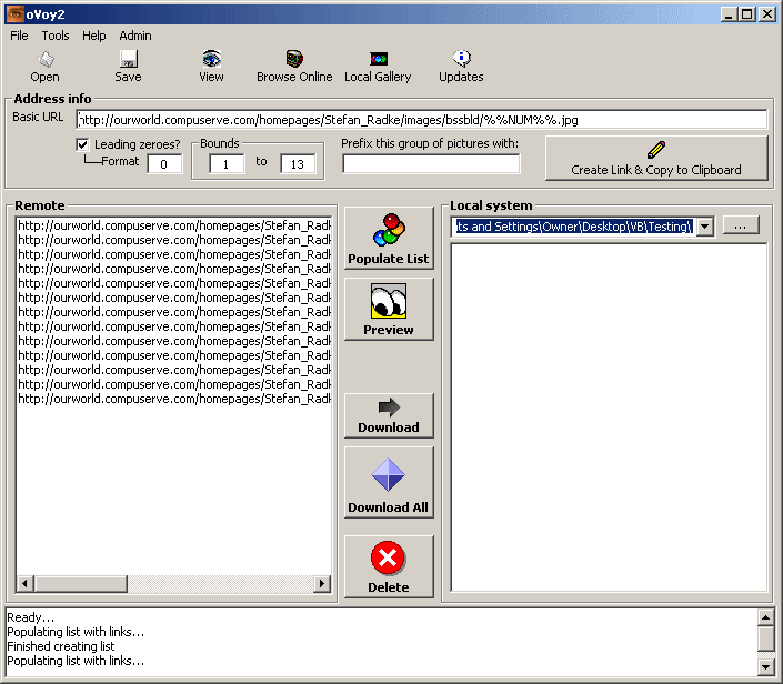 This is an improvement to a previous program. Features include: saving config files for use later, browse galleries online, watch a series of pictures like a slideshow with the use of timers, download an entire numbered series of files(not just pictures) to your computer, create and trade custom protocol urls, check for updates online(source for updater is included. it can EASILY be fitted to be an updater for any program), an admin panel to change the update message via FTP and there's a dynamic menu to hold 'favorites'. To use this, enter a url in the box like this: https://www.website.com/images/picture%%NUM%%.jpg . As long as the picture names are all the same except for an index number, replace the number itself with %%NUM%%, fill in the leading zeroes and boundaries accordingly, click populate list and go from there. It's an awesome downloader if you have broadband(although only picture files appear in the local folder list, it WILL download any file type like movies etc). You can even prefix entire sets of files. It is only lightly commented so feel free to ask questions.