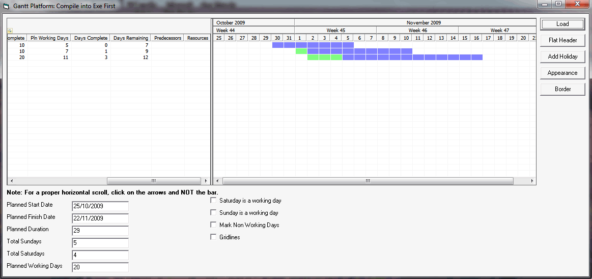 This is a gantt chart platform that I am working on. I have been looking for a gantt chart which is open source to no avail that I can easily customize. This is just the start, thus the platform. Please feel free to contribute. This demonstrates the following: subclassing listview, detect horizontal scrollbar movement, synchronize horizontal scroll bar movement, listview header tooltip, working days between two dates, addition of holidays, flat listview column header, freezing windows updates, highlighting multiple listview columns, sundays between two dates, saturdays between two dates, searching collections. Please contribute and enjoy. This version now boasts the color drawings to show progress between planned and worked until / actual. I need to only show horizontal grid lines and would appreciate any feedback on that. This is still a work in progress.