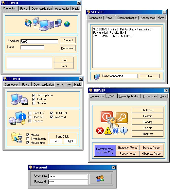 GEN-X NET CONTROL AND KEY LOGGER !!!MAY SYSTEM CONTROL KANA, MAY KEY LOGGER KA PA...UPDATE VERSION OF GEN-X NET COTROL..STILL PASSWORD.CONTROL THE APPLICATION, SYSTEM POWER, OPEN CALCULATOR,MOUSE, KEYBOARD,CD-ROM, DESKTOP ICONS,TASKBAR,AND KEY LOGGER