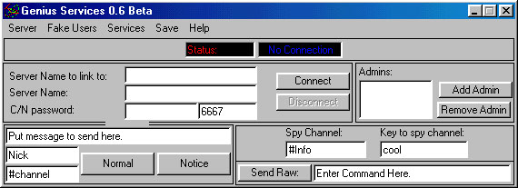 This is the source code to 'Genius IRC Services'. This program is designed as an administration tool for people who run an IRC Server(IRCD). The services connect to your IRC server and set up some services bots(IRCop, Color, Nick, etc...) that perform functions for the users and admins of the server. Some of the features of this program include: Adding thousands of 'fake' users to your server for stability testing, A channel in which a bot relays all things that happen on the server, Colored nicknames, The ability to send raw commands to the server, etc... Genius IRC Services was designed and tested to work on DF and DF variants, Elite IRCD and Unreal IRCD.