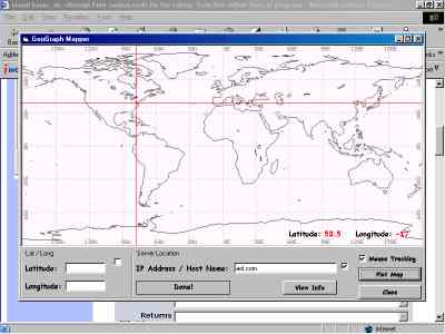 OK Here it is 1 more time, I can't get used to those edit options and I think I deleted the last update. I fixed a lot of the problems, thank you for your feedback. You can now map out private a IP address or Host Name in the united states as well as web address (well most) I added another Whois Server to the search, I will clean it up more in the next update. If you voted for the last submission, please vote again here, I will continue to update this post only. I also fixed the rpoblem with the latitude and longitude display on the map when moving the mouse around. please email me with any bugs you find and enjoy the application. please vote for this code if you like it.