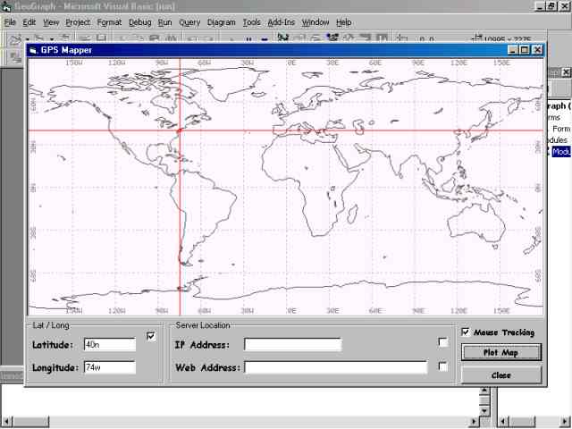 Plot points on a world map based on latitude and lonitude in degrees. This application is still being worked on and should be finished soon. Just type in the Latitude and Longitude then click Plot Map it will display the crosshair in the correct position on the world map. I intend to use this application in an IP host Name tracer application to plot the location on a map of where the servers are located. Please vote if you like this code - oh yeah if you have any questions please email me.