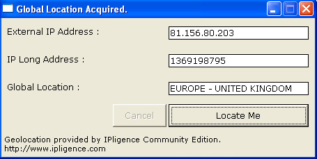 Get your geographical location without the use of the registry and system settings. This is a component of my Global Assistant App which is being designed not to use system settings, as we all know people can get stuff up wrong when setting up Windows. Displays use of IP To location database and the conversion of a Dot IP to Long IP based on ISO3166. The acquasition of the external IP isn't tested on proxys (It would be good to know if it is still effective)