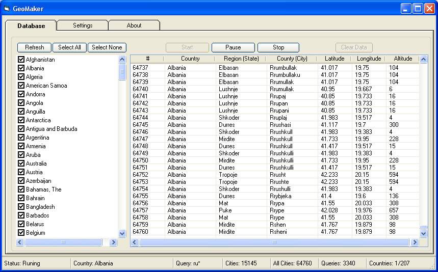 Create the GeoDatabase for the entire world. This program create the geographical location Latitude, Longitude, and Altitude (Elevation) for every city, village, region, state, county in the World. The program crawls the data from the website www.heavens-above.com which collect data from US Geological Survey for the USA (and dependencies) and The National Imaging and Mapping Agency for all other countries.Version 2.0 fixes the USA database issues and other fixes.