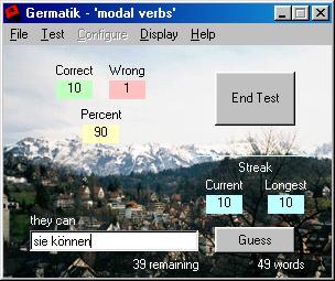 This program started out two years ago as a text only program in GW-BASIC. At the time, that was all I knew how to do. It was a pain to change the list of words. Since then, the program has grown considerably. You can easily add words, change words and even look up the correct article for nouns (der/die/das)! It even gives you a score at the end of the test!