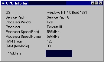 This code will quickly tell you a lot of your system information like computer name, IP address, OS, Service Pack, Processor Vendor, Processor Type, Processor Speed (Raw and Normal), RAM (Total and Available).