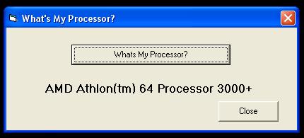 Get The Name Of Your Processor eg(AMD Athlon (tm)64 Processor 3000+) As You See It In The Control Panel-System Window. I Have Posted This Purely Because I couldn't Find The Code On VBC Any Where, Only Code That Gives You x86 N' Stuff Like That. I don't Know If It's Cheating But I Just Get It From The Registery.