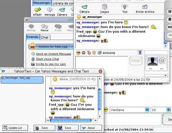 Do you want to save your conversations from Yahoo! Messeenger with colors/fonts/smileys? here's the solution!. you can write whatever you want and before close the IMWindow, open GetY!Text, double click the window you want to save the conversation from in the GetY!Text list and the app will get the text for you, ready to be saved In HTML Format or In a Word Document!