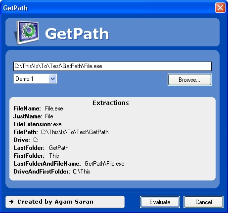 Do you use different functions to extract Filename, Filepath, or Extension from a path. GetPath is a function that can extract 9 different parts from a path. It can extract FileName, JustName, FileExtension, FilePath, Drive, LastFolder, FirstFolder, LastFolderAndFileName and DriveAndFirstFolder. It supports relative paths too. Try to parse "C:\Look\At\The\FileExtension\Of\This\Path.exe\" to your GetExtension function and then it to my GetPath function. Also try "C:\Temp\Is\A\File\Not\A\Folder\Temp". You will know the difference. I will feel glad to hear your comments and suggestions.