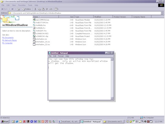 Using a very basic method of moving forms around, this code will create a shadow effect to any window that currently has focus. Browser windows, Message Boxes, everything. The method is very basic. A loop just runs getting the hWnd of the window that has focus, if it is not maximized or minimized and is visible, it puts shadow forms to the right and bottom of that window and using some generic (over used) transparent code, those shadow forms are made transparent. See the screen shot of how Notepad now has a shadow on it. The shadow follows the form and for the most part, is not a bad effect. Yes more coding needs to be done for special cases and to stop some flicker now and then depending on how busy the machine is. Also the ability to through it down to the system tray (I have gotten into a habit of using a control (OCX) I made for doing that so I did not add that code here since I knew I was posting this). Anyhow, have fun, play with it if you like and make it better. If you do, I would love to see it get posted. Perhaps giving options for shadow size and color (hint).